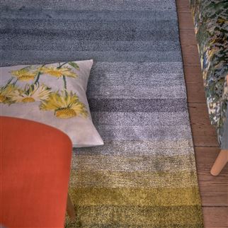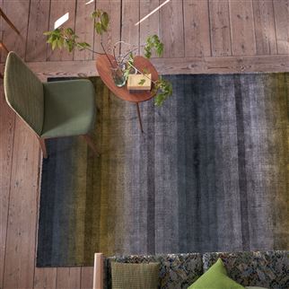 Великолепные оттенки лазурного, болотного и изумрудного в сочетании с черными нитями создают растушеванные полосы, украшающие этот ковер в современном стиле с едва заметным глянцевым отливом. Ковер изготовлен из тенсела и вискозы.
