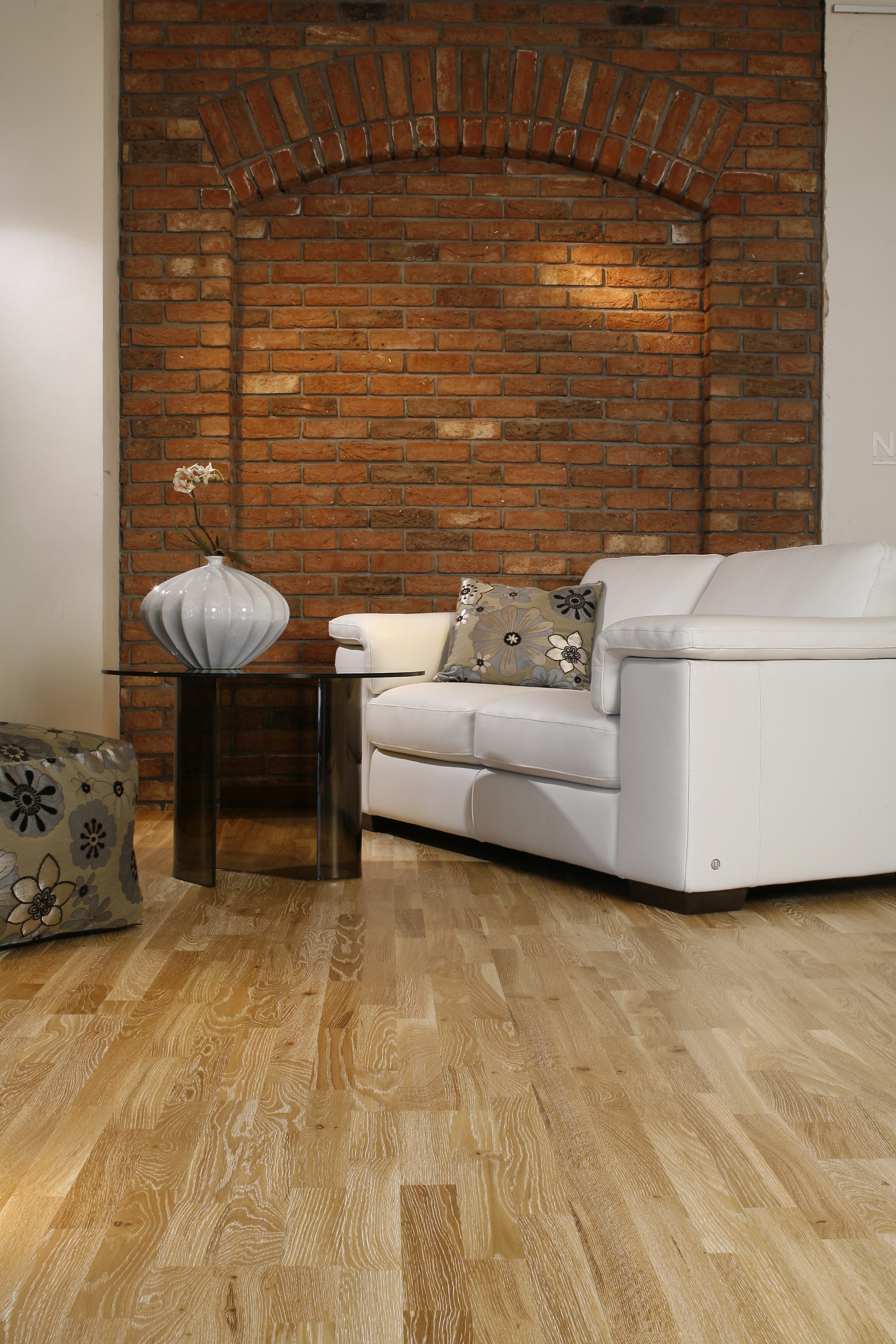 Структура древисины четко подчеркнута благодаря брашированию и белой морилке в полостях. Поверхность характеризуется заболонью и большими сучками. Умеренная разнотонность.