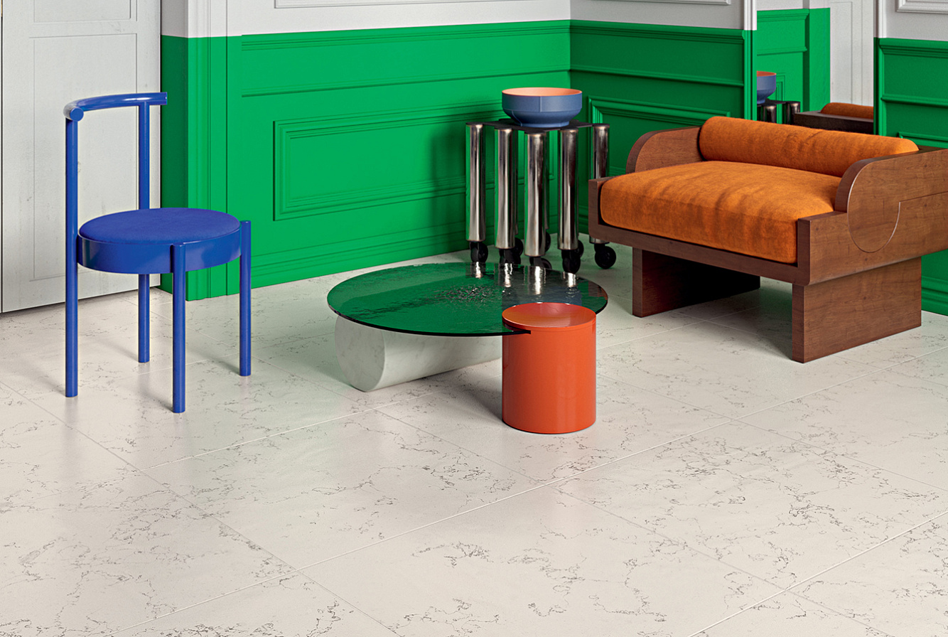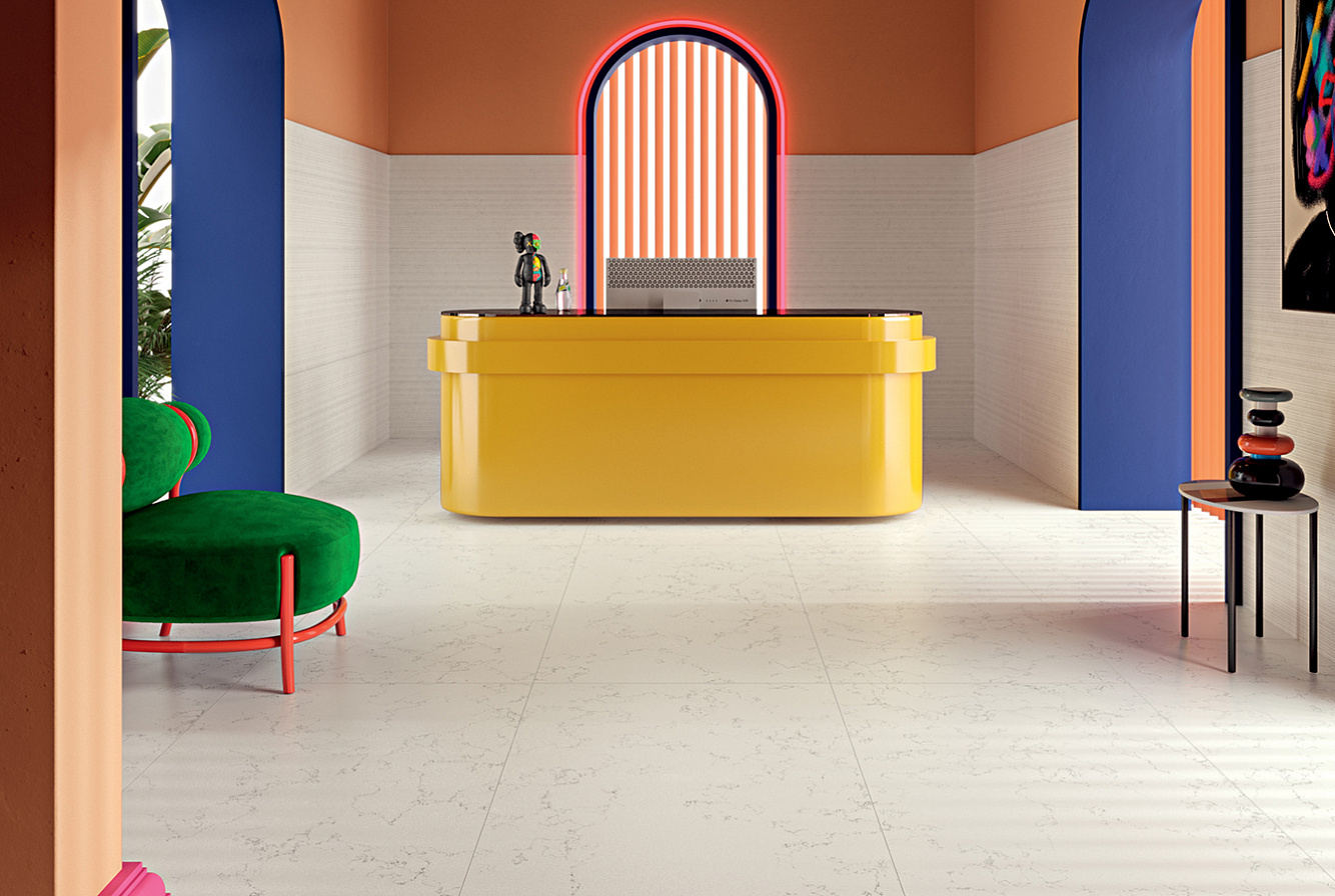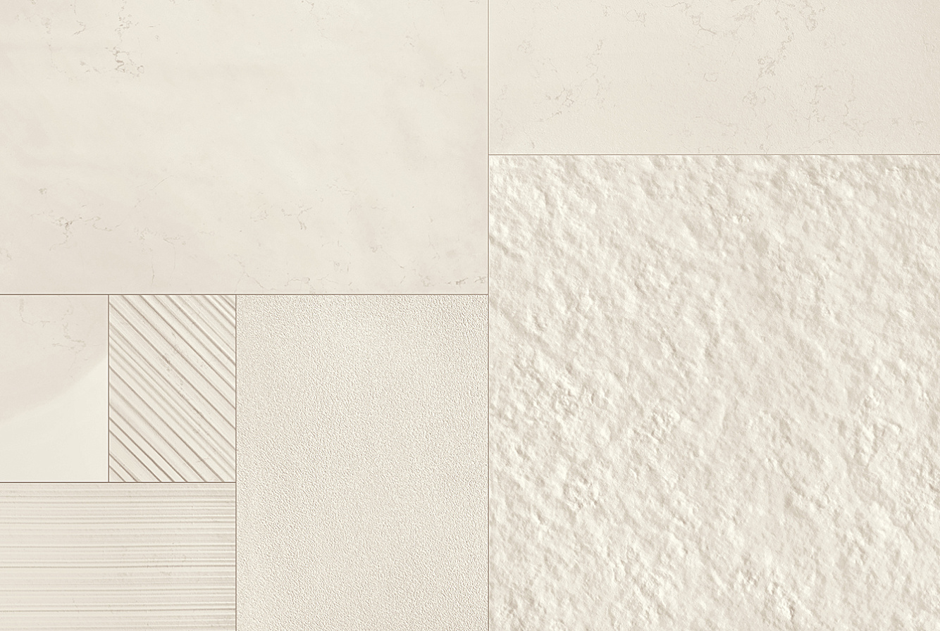 "Керамогранитная" часть коллекции SCW имитирует сорт светлого мрамора в шести вариантах отделки поверхности и дополнена легким, ненавязчивым терраццо Happy. Базовый формат для керамогранита — 60х120 см.