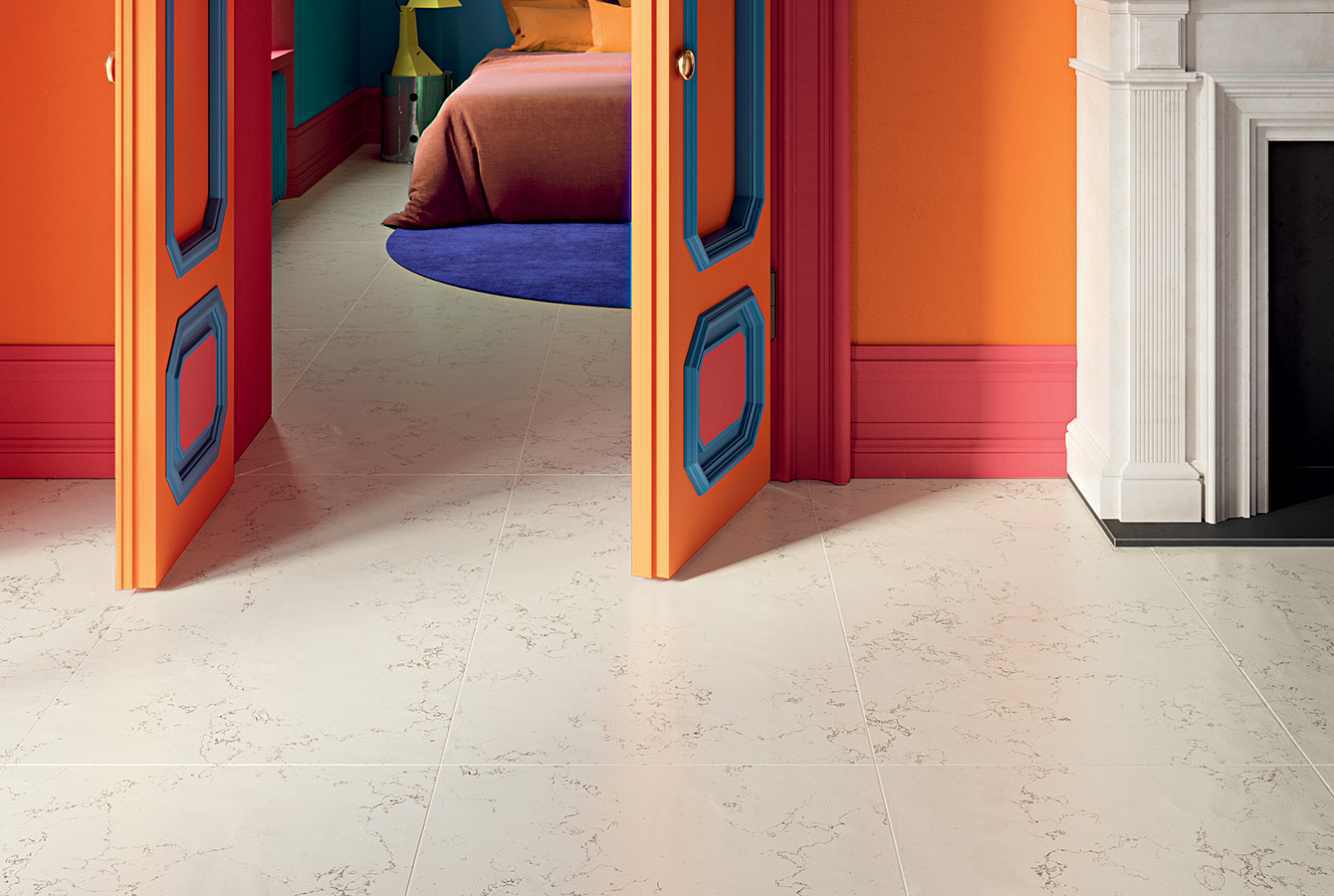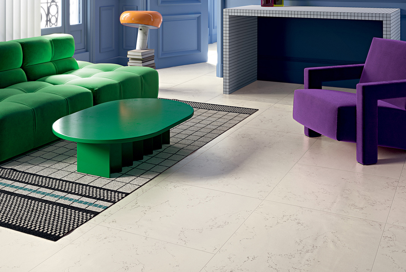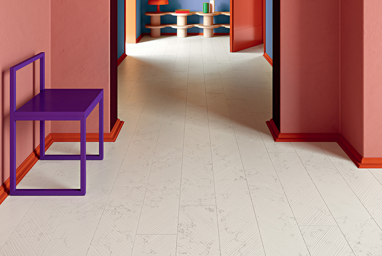 "Керамогранитная" часть коллекции SCW имитирует сорт светлого мрамора в шести вариантах отделки поверхности и дополнена легким, ненавязчивым терраццо Happy. Базовый формат для керамогранита — 60х120 см.