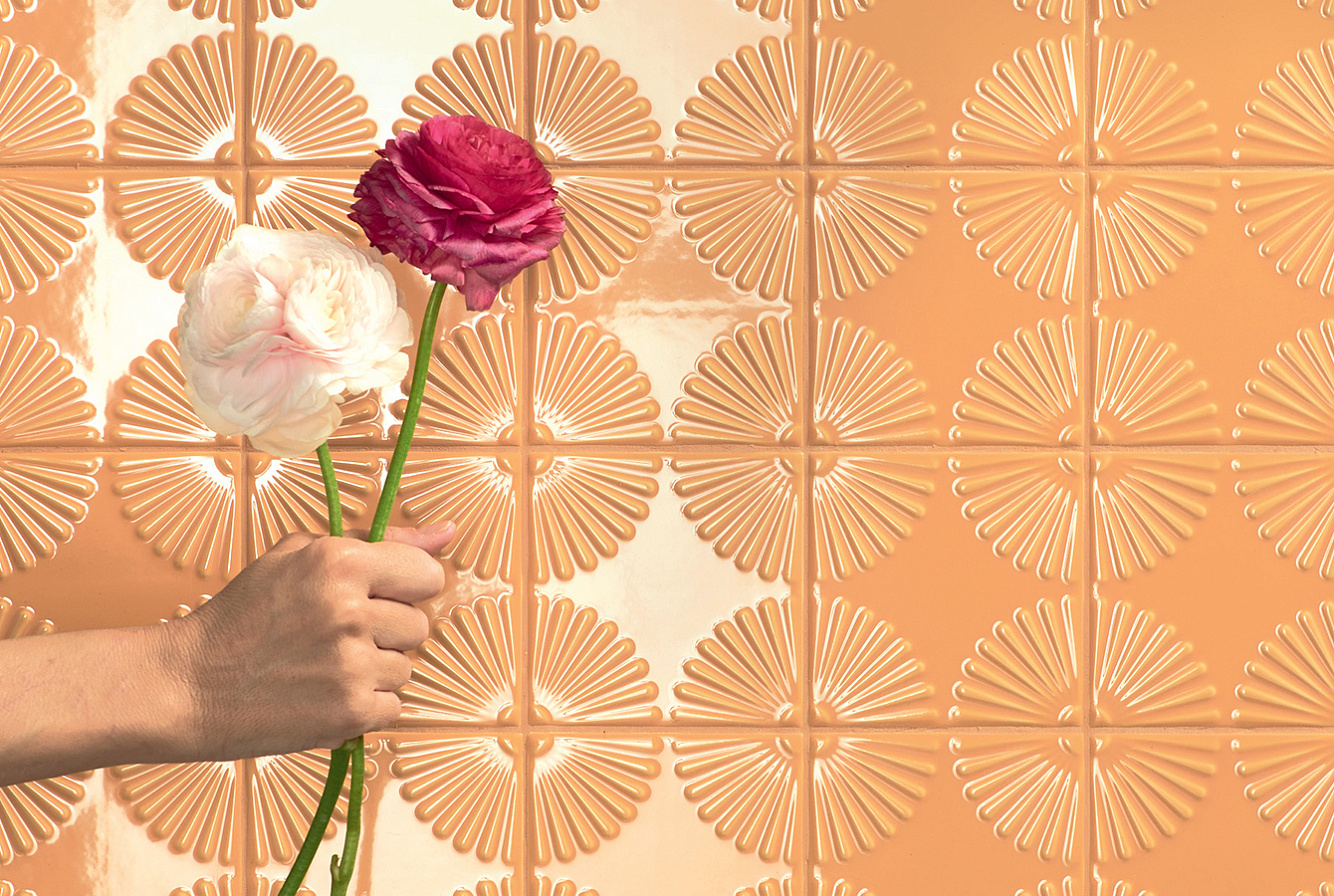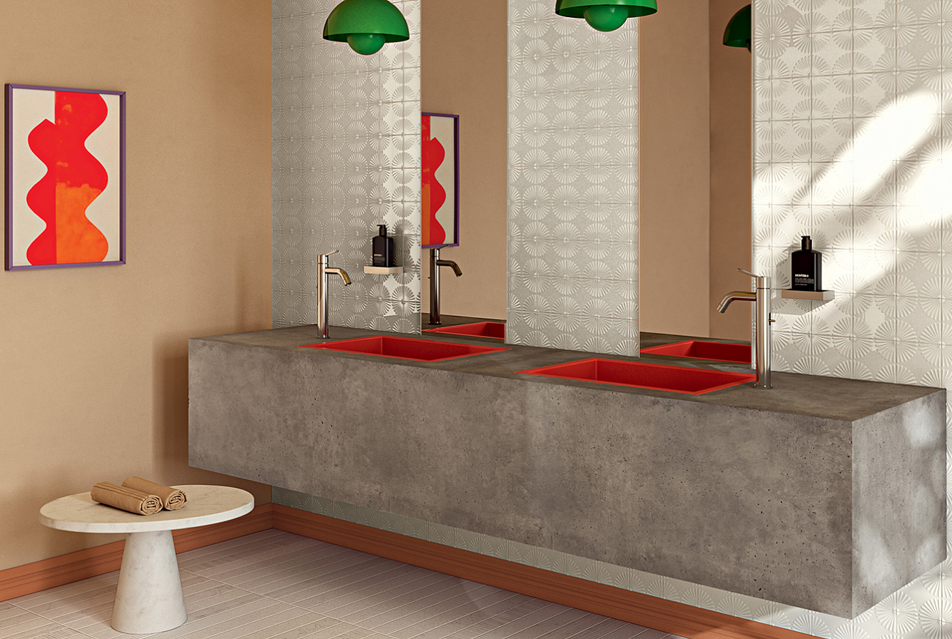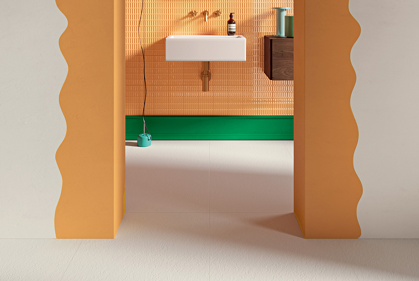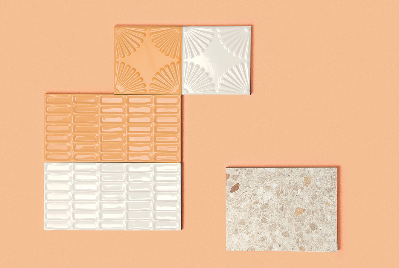 Для декорирования стен предлагаются два варианта керамической плитки Bloom 12,5х12,5 и Waffle 12,5х25 в оттенках Bianco и Mandarino.