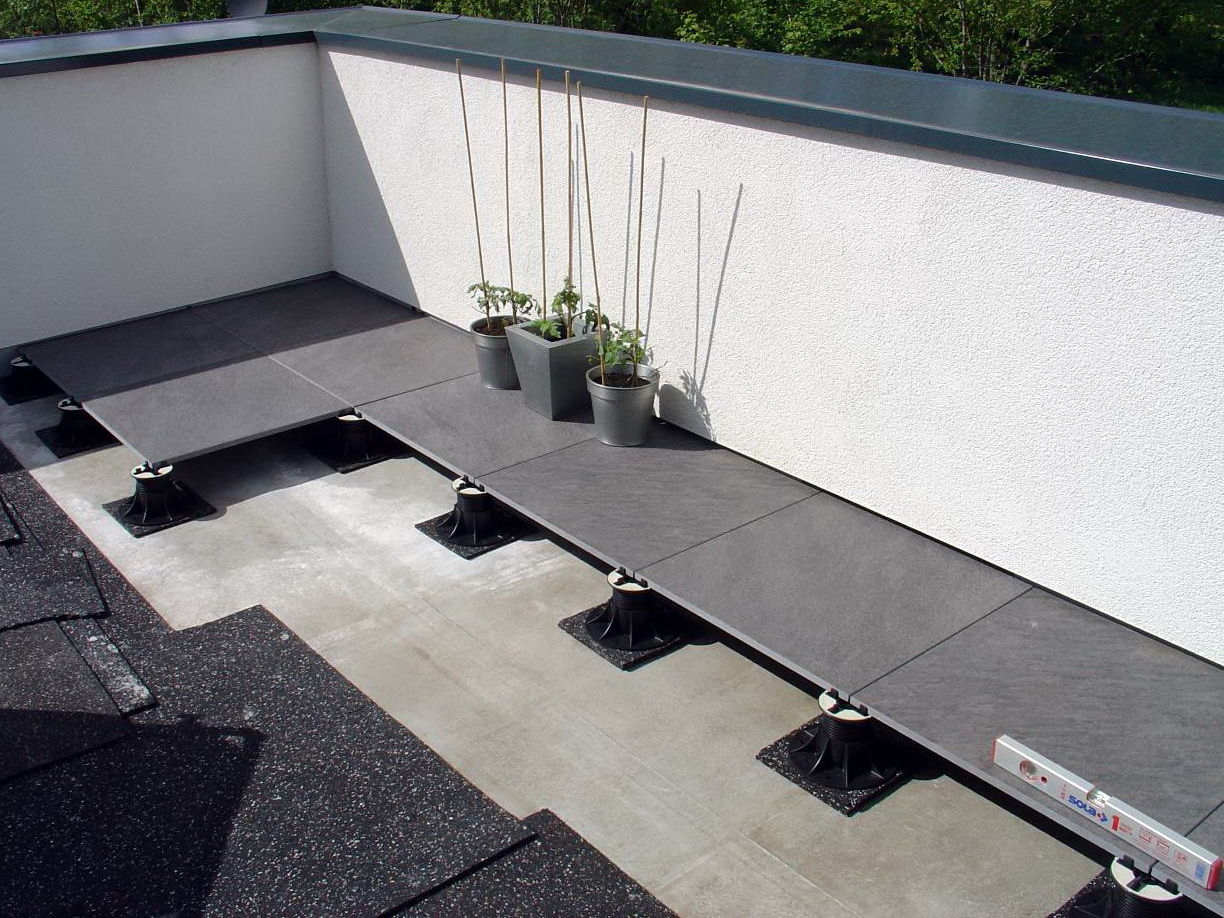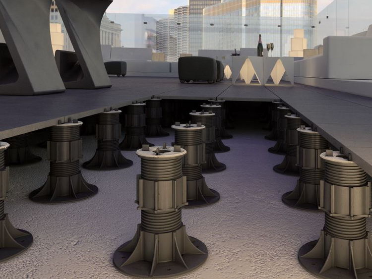 Автоматическая коррекция угла наклона - до 5 градусов,верхняя резиновая вставка сокращает уровень шума и вибраций (до 25 dB). Фиксатор опоры от излишнего выкручивания. Система регулировки высоты готового настила с помощью специального ключа. Основание опоры площадью 320 кв. см. + система дренажных отверстий. Наконечники зазора плитки с возможностью легкого демонтажа.
