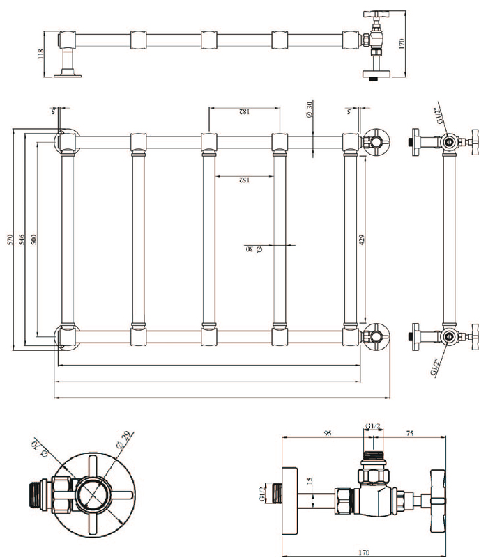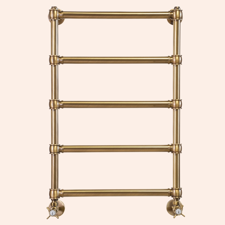 TW 800GVS, полотенцесушитель водяной для систем ГВС, латунь, рр по центру 500хh865мм, укомплектован вентилями и к-т для подключения, цвет: бронза