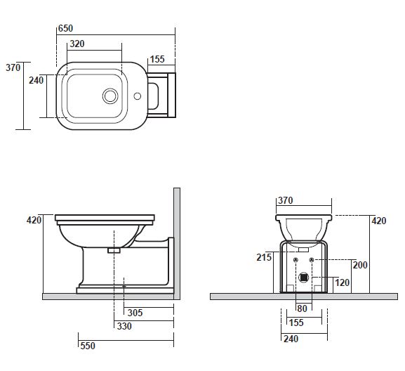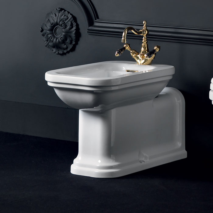 4120K1bi/cr*1    Kerasan Waldorf Биде напольное пристенное удлиненное "Prolongato" 65х37см с 1 отв. под смеситель, белое, цвет заглушки - хром